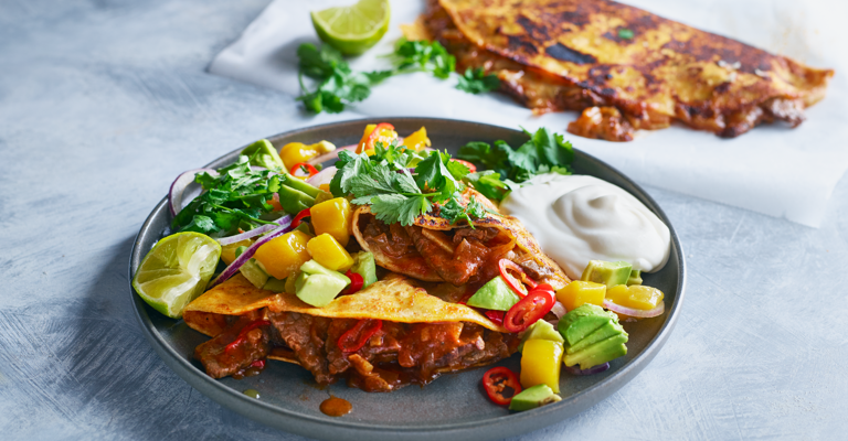 التقديم: يُلف التورتيلا حول الحشوة ويُقدم ساخنًا، ويمكن تقديمه مع صلصة حارة أو صوص طماطم.