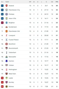 ويتقدم أرسنال بفارق 5 نقاط عن مانشستر سيتي صاحب المركز الثاني برصيد 25 نقطة، فيما يحتل تشيلسي المركز الثالث بـ24 نقطة، متفوقًا بفارق الأهداف على أستون فيلا الذي يأتي رابعًا.