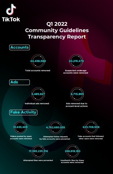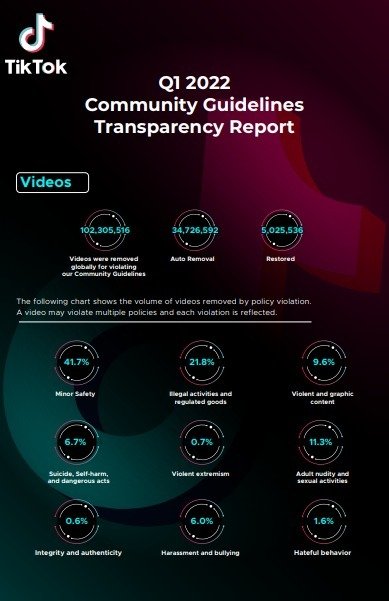 وكشف التقرير الجديد أنه تم إزالة أكثر من 102.3 مليون مقطع فيديو مخالفًا خلال الربع الأول من عام 2022، وهو ما يمثل حوالي 1٪ من جميع مقاطع الفيديو التي تم تحميلها. وقد تم إزالة ما يتجاوز 34.72 مليون مقطع فيديو تلقائيًا ، بينما تمت استعادة أكثر من 5.025 مليون مقطع فيديو.