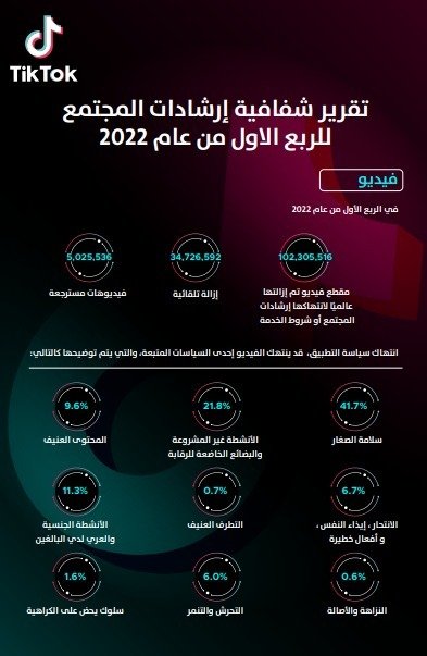 تيك توك تحذف أكثر من 102 مليون فيديو خلال الربع الاول لعام 2022 لانتهاكها إرشادات المجتمع.