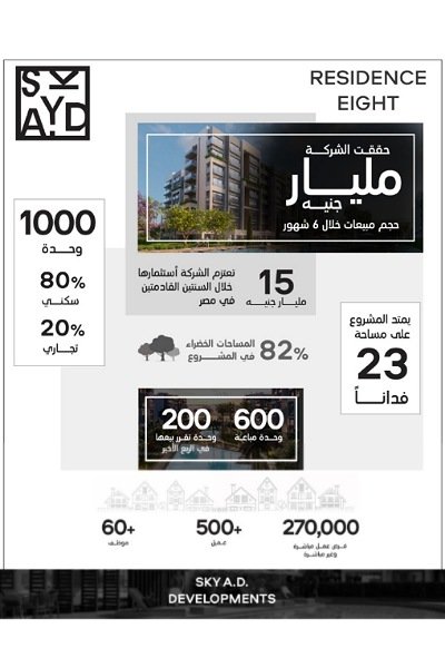 سكاي أبو ظبي إضافة قوية للقطاع العقاري المصري .. العملاق الإماراتي يحقق مليار جنيه مبيعات من مشروعه الاول Residence Eight بالعاصمة في وقت قياسي.