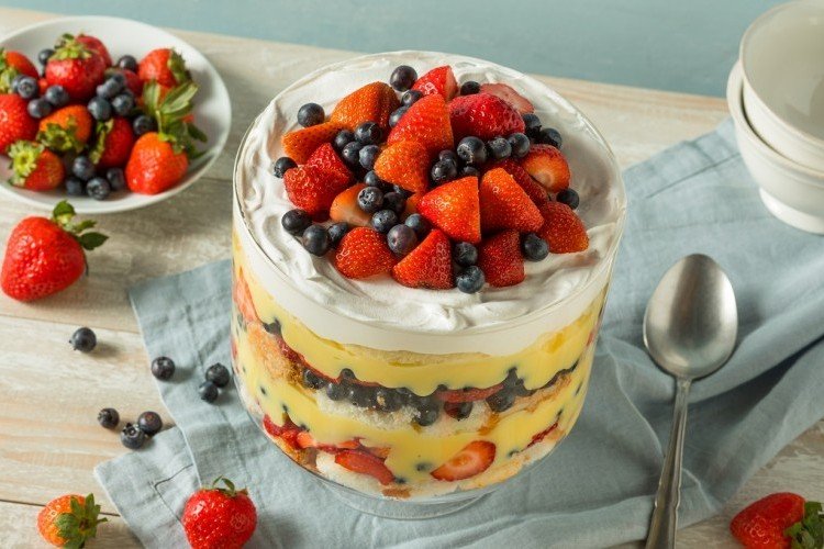 يُعدّ الترايفل بالفواكه من أشهى وأجمل أنواع الحلويات الباردة، التي تُقدَّم عادة في المناسبات والعزائم أو كتحلية خفيفة بعد الوجبات. يتميز هذا الطبق بطبقاته الملونة والمنسقة من الكيك، والكريمة، والفواكه الطازجة، مما يجعله مزيجًا رائعًا من المذاق والمنظر.