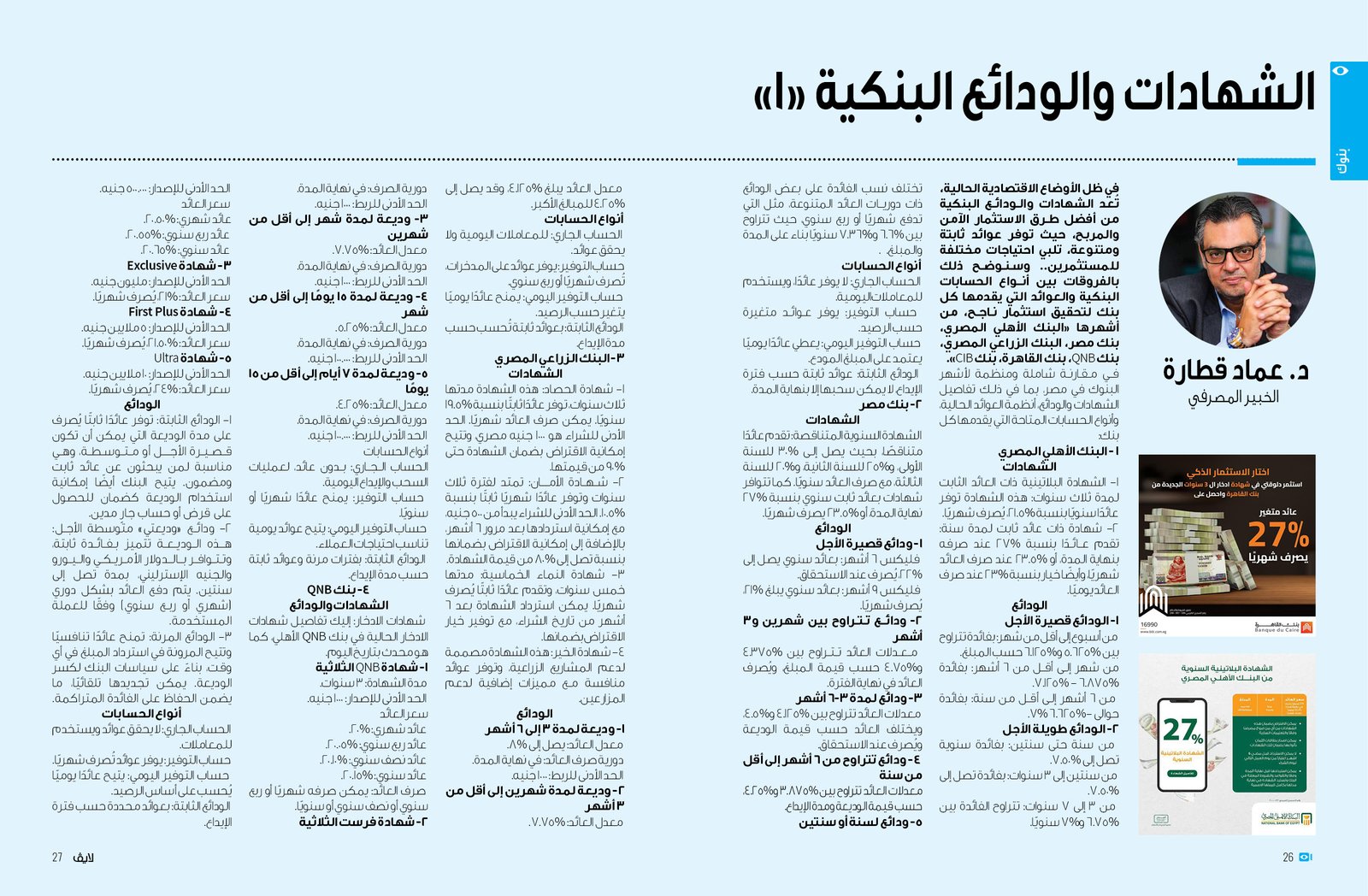 في ظل الأوضاع الاقتصادية الحالية، تُعد الشهادات والودائع البنكية من أفضل طرق الاستثمار الآمن والمربح، حيث توفر عوائد ثابتة ومتنوعة، تلبي احتياجات مختلفة للمستثمرين.. وسنوضح ذلك بالفروقات بين أنواع الحسابات البنكية والعوائد التي يقدمها كل بنك لتحقيق استثمار ناجح، من أشهرها «البنك الأهلي المصري، بنك مصر، البنك الزراعي المصري، بنك QNB، بنك القاهرة، بنك CIB».