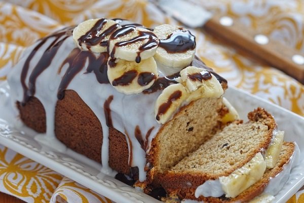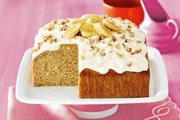 للتزيين: اخفقي الجبن الكريمي مع السكر جيداً حتى تتجانس المكونات تماماً، ثم أضيفي 2 ملعقة كبيرة من الزبادي مع الاستمرار في الخفق حتى تمام التجانس، وزيّني الكيكة بمزيج الجبن الكريمي، وشرائح الموز، والجوز، ثم قدميها.