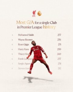 واحتفى نادي ليفربول بالإنجاز التاريخي لنجمه المصري، حيث نشر عبر حسابه الرسمي على منصة «إكس» رسالة جاء فيها: «يمتلك مو الآن أكبر عدد من المساهمات التهديفية مع نادٍ واحد في تاريخ الدوري الإنجليزي الممتاز».
