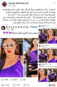 وكتبت ياسمين عبد العزيز، عبر حسابها بموقع التواصل الاجتماعي “فيس بوك”: “الحملات بدأت، ومطلِّعني عريانة في كل حتة.. طيب تمام، نرفع قضية، ومباحث الإنترنت تجيب مين اللي ورا الحملات والتشويه لصورتي بالطريقة دي!!، كل دة عشان إعلان المسلسل نزل؟؟، أومال لما المسلسل ينزل هتعملوا ايه؟”.