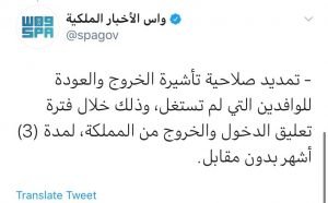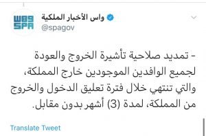 و تمديد صلاحية تأشيرة الخروج و العودة لجميع الوافدين الموجودين خارج المملكة.