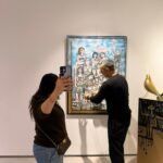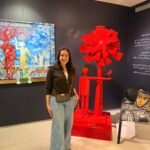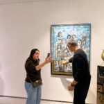وإستعرض الفنان خلال الجولة عددًا من أبرز أعماله، من بينها لوحة مستوحاة من موقف يومي بسيط تحولت فيه بقعة قهوة إلى عمل فني يحمل رسالة عميقة، قائلاً: «من القبح ممكن نطلع حاجة حلوة.. الغلطات مش نهاية، دي بداية لتكوين شخصية أقوى»، مشيرًا إلى أن العمل يحمل عنوان «She was once a stain».