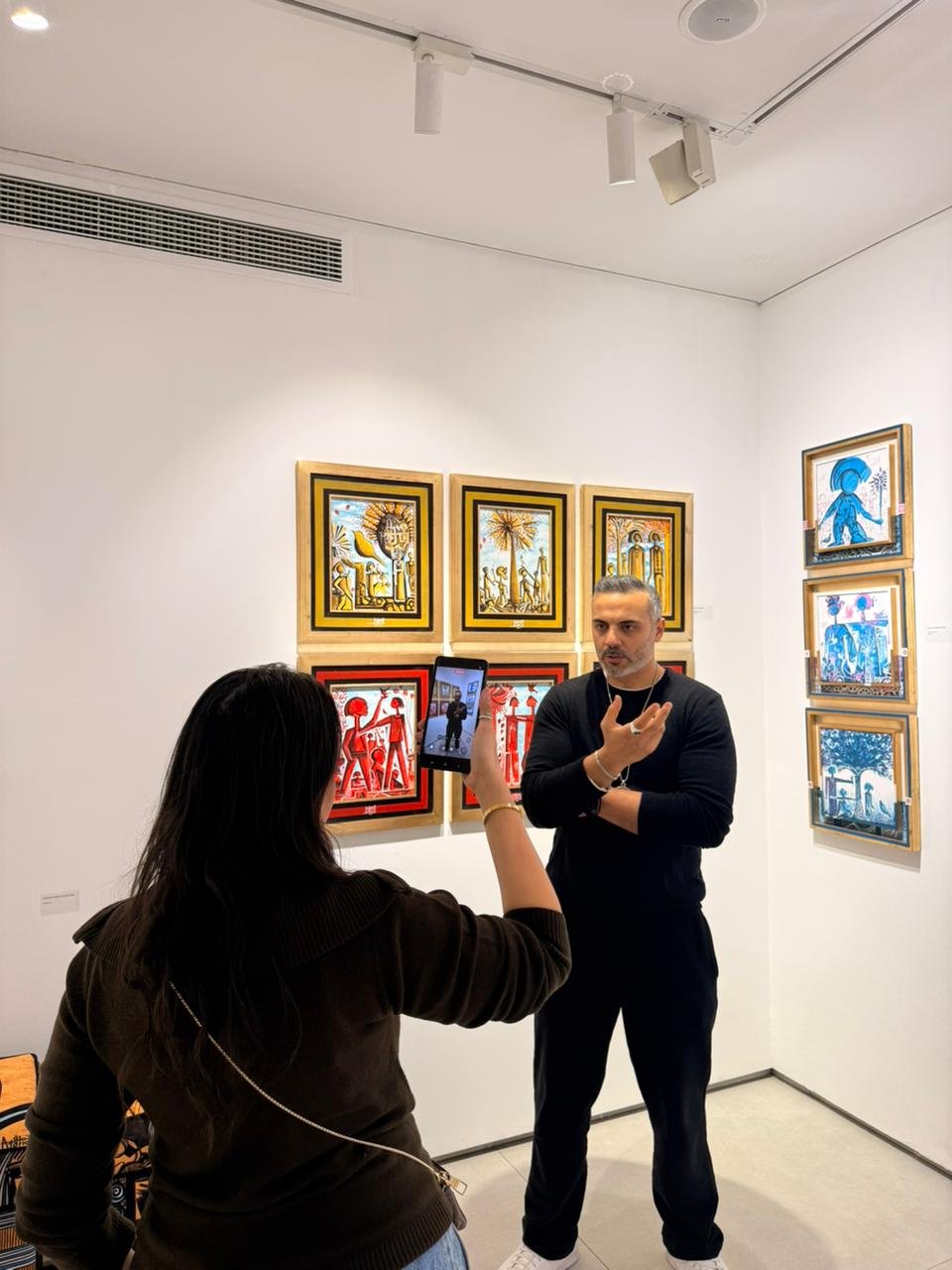 وإستعرض الفنان خلال الجولة عددًا من أبرز أعماله، من بينها لوحة مستوحاة من موقف يومي بسيط تحولت فيه بقعة قهوة إلى عمل فني يحمل رسالة عميقة، قائلاً: «من القبح ممكن نطلع حاجة حلوة.. الغلطات مش نهاية، دي بداية لتكوين شخصية أقوى»، مشيرًا إلى أن العمل يحمل عنوان «She was once a stain».