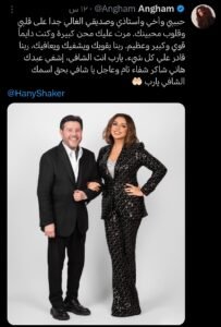 بناء على ذلك أنغام تطلب الدعاء لهاني شاكر وختمت تدوينتها بنبرة إيمانية خالصة وتوجهت بالدعاء الصادق إلى الله عز وجل لكي يمن عليه بالشفاء التام والمعافاة الدائمة قائلة “يا رب أنت الشافي إشفِ عبدك هاني شاكر شفاء تام وعاجل يا شافي بحق اسمك الشافي”