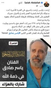 ولكنه أصغر منه بثماني سنوات وأشار عبدالله إلى المعاناة الصحية التي عاشها الراحل في الفترة الأخيرة مؤكداً أن صبره العظيم على آلامه سيكون طريقاً له نحو النعيم الخالد بإذن الله وطالب الجمهور بالدعاء له وقراءة الفاتحة على روحه الطاهرة وداعاً ياسر صادق .