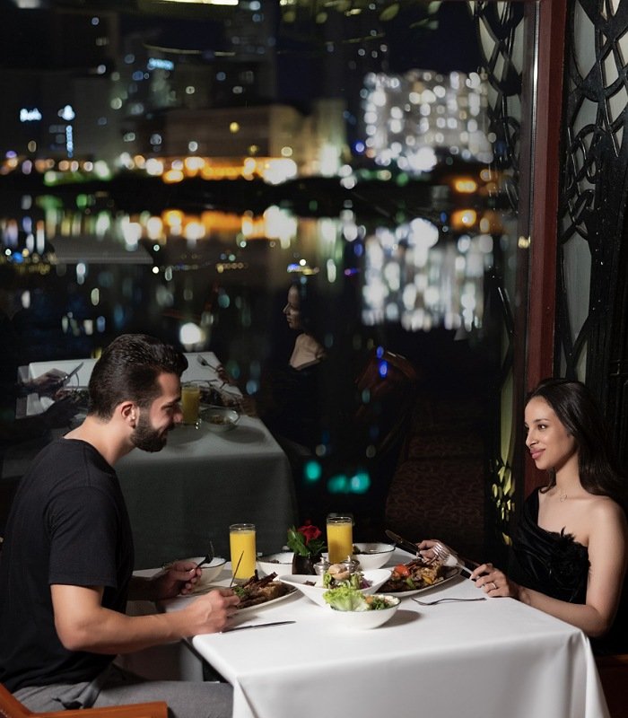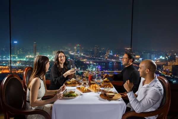 عليك بعد ذلك التوجه إلي المطعم الدوار فهو اختيارك الأمثل لإستقبال العام الجديد سواء كنت تفضل عشاء رومانسي والإحتفال ببداية عام 2025 مع عشاء فاخر ومجموعة مختارة من أشهي المقبلات والأطباق والحلويات وأجواء احتفالية مفعمة بالترف والأناقة و يمكنك ايضا الاستمتاع بعشاء الكريسماس مع إطلالة فريدة بزاوية 360 درجة على قلب العاصمة ونيلها الساحر وأضوائها المتلألئة علي أنغام الموسيقي الحية.