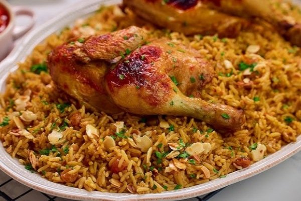 ختاماً وبعد التأكد من نضج الأرز وتصاعد بخاره العطر اسكبي الأرز في طبق تقديم واسع ووزعي قطع الدجاج المحمرة فوقه.